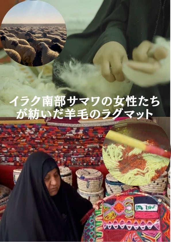 こちらもポップアップストアin札幌で毎回人気の純毛ラグマットです。イラク南部のサマワの女性たちが、刈り取った羊毛を洗い、染色し、織り上げています。