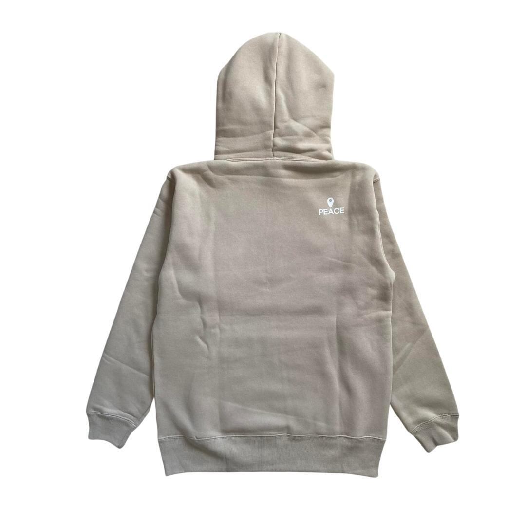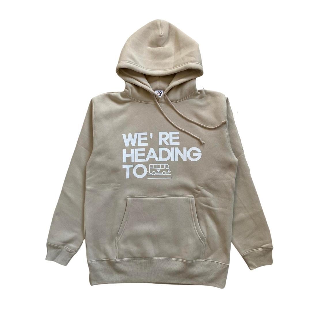 フロントのバスは、イラクで走るモバイルライブラリー(移動図書館)のイメージです。フロントに"WE'RE HEADING TO"(私たちは向かっている)とあり、バックの右肩にロケーションマークで"PEACE"(平和)。道のりは長いけど、目的地はセットされているよ!という思いを込めました。Chari-Tee for Aidのロゴである「傷ついたハート」もチラッと入れています。